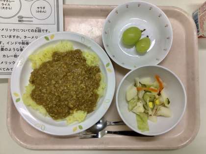 今日は、ターメリックライス、レンズ豆入りキーマカレー、ポテト入りフレンチサラダ、ぶどう(シャインマスカット)です。
