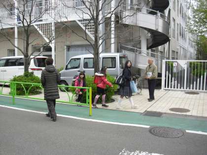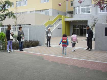 北門と南西門の様子です。北門の八重桜の下を子どもたちが登校してきます。「おはようございます。」さわやかなあいさつが新校舎に響きます。あいさつキャンペーンは本日で終了しますが、あいさつが定着するように学校全体で取り組んでいきます。