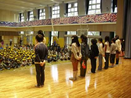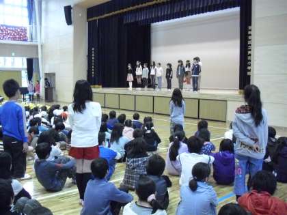 今朝の児童集会の様子です。第1回目の集会は、委員会活動の紹介です。各委員会の委員長が仕事の内容を話します。その間、委員会に所属する5・6年生は立って、みんなに顔を覚えてもらいます。よりよい学校生活を送るために5・6年生が進んで活動していきます。