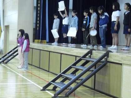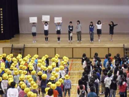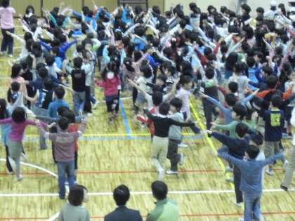 児童集会の様子です。新しく芦花小学校に来た先生クイズです。先生方の子どものころのエピソードなどを問題にし、三名の先生の名前を上げ、1番の先生ならウルトラマンポーズ、2番の先生ならグリコのポーズなどと答えを表現していきます。クイズごとに正解の先生にインタビュー形式で、問題となったエピソードについて話してもらいます。楽しいクイズに子どもたちとの距離もグッと近づきました。