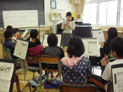 6年生の音楽の授業の様子です。「ラバーズコンチェルト」のリコーダーの演奏に取り組んでいるところです。リズムやきれいな音色の出し方を身に付けます。高学年では、楽譜を見て歌ったり、演奏したりする力を身に付けます。友達と教え合いながら学習を進めます。
