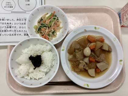 今日は、ごはん、海苔の佃煮、豚肉と大根のうま煮、野菜のごまみそかけ、牛乳です。