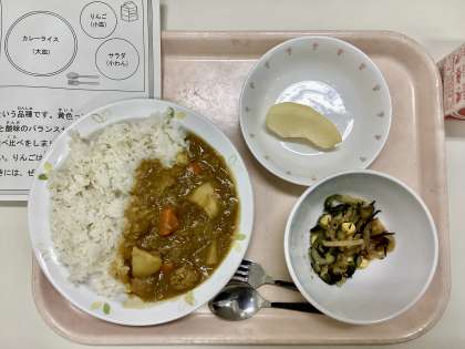今日は、カレーライス、大根とひじきのサラダ、りんご(シナノゴールド)、牛乳です。