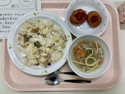 今日は、きのこピラフ、ヌードルスープ、豆腐のナゲット、牛乳です。