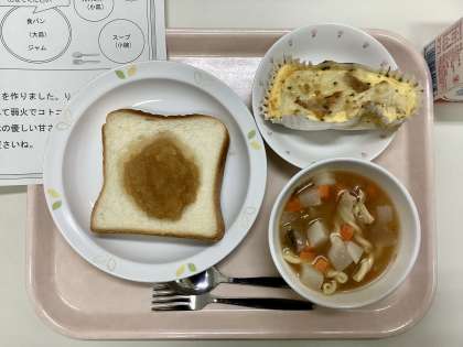 今日は、食パン、手作りりんごジャム、フレンチエッグ、ミネストローネ、牛乳です。