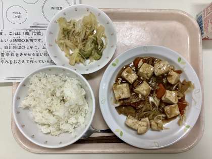 今日は、麦ごはん、四川豆腐、白菜の中華サラダ、牛乳です。