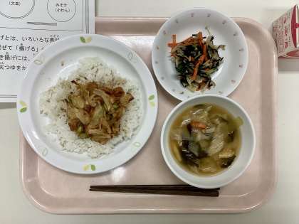 今日は、かき揚げ丼、キャベツのみそ汁、のり酢あえ、牛乳です。