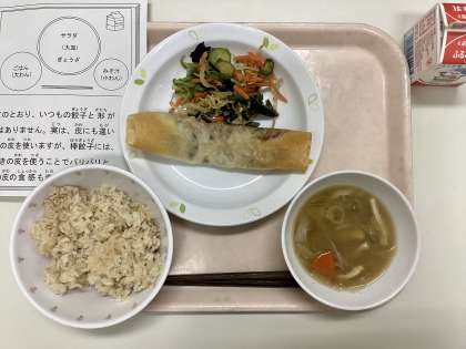 今日は、生姜とごまのごはん、棒餃子、カリじゃこサラダ、さつま芋と白菜のみそ汁、牛乳です。