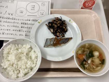 今日は、ごはん(有機米)、魚のゆずみそがけ、大豆の磯煮、白玉入りすまし汁、牛乳です。