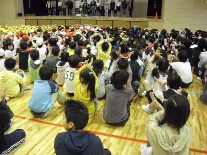 後半は○×クイズです。映像の中に出てきた清掃のやり方が問題となっています。子どもたちは、両手で○や×のゼスチャーをしながら答えます。みんな正解です。清掃の手順も覚えました。あとは行動で示していきます。