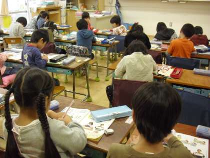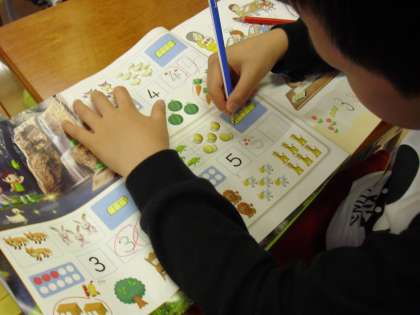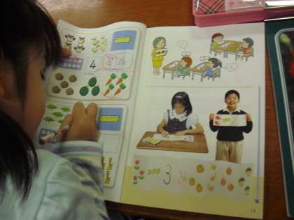 1年生の算数の授業の様子です。数の学習をしているところです。教科書の絵を数えながら数字での表し方を学んでいます。1年生では、具体物を用いた数える活動を通して、数についての感覚を豊かにしていくことが大切です。