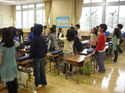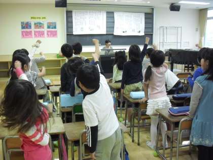 2年生の音楽の授業の様子です。運動会の歌を歌っているところです。「あか、あか、あか、ゴーゴーゴー!」「しろ、しろ、しろ、ゴーゴーゴー!」と、拳を突き上げながら元気よく歌っています。気分は運動会のようです。