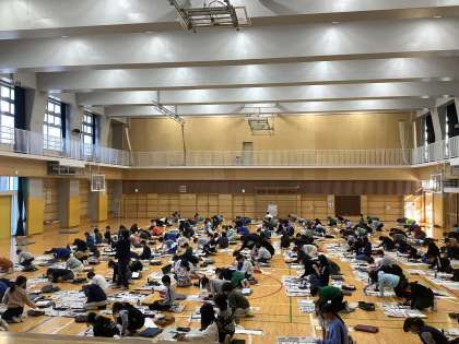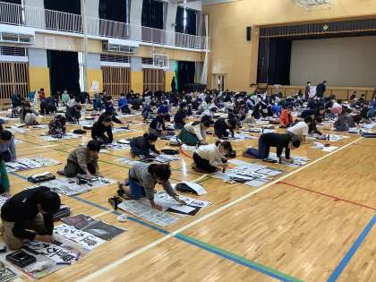 さて、5年生は始業式の後、2時間目と3時間目を使い席書会を行いました。