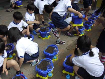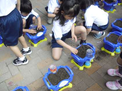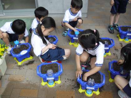1年生の生活科の授業の様子です。アサガオの植木鉢に石を入れ、土を入れ、種をまいているところです。これからアサガオのお世話がはじまります。大きく大きく育つように毎日大切にしていきます。