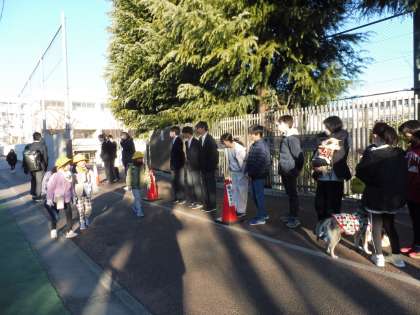 芦花小6年生と芦花中の生徒のみなさんが、元気のよいあいさつで子どもたちを迎えています。