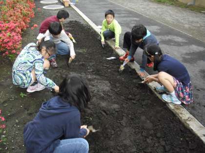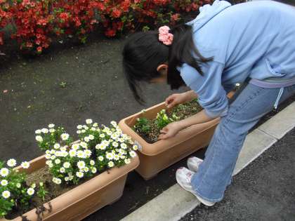 図書委員会、栽培委員会の様子です。新しい図書室となり、本の貸し出しや整理の仕方の共通理解をしているところです。栽培委員会は、仮設校舎の校庭にあるプランターを新校舎側に移動させ手入れを行ったり、花壇にヒマワリの種を植えたりしています。