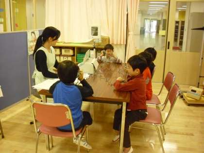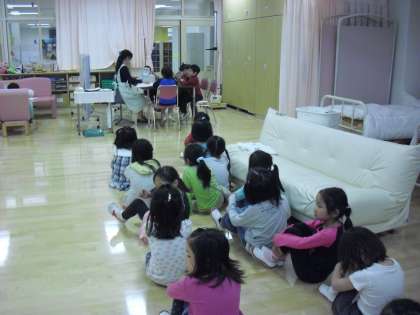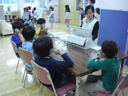 1年生の聴力検査の様子です。現在は定期健康診断中です。様々な測定や検査を行っています。養護教諭の説明を聞きながら検査の器械をを耳にあてる1年生。待っている子どもたちも音を出さないように静かに並んで座っていました。このような積み重ねを通して集団生活のルールを学んでいきます。