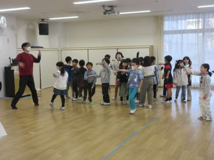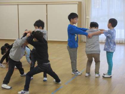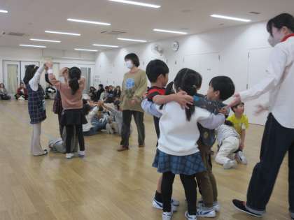 3人組や4人組になって「あさがお」が種から花を開くまでの様子を表現したり、動物や傘になってみたりと、全身をつかって楽しんでいました。