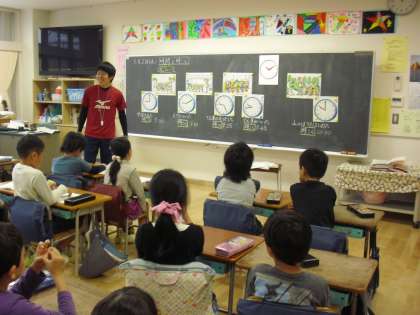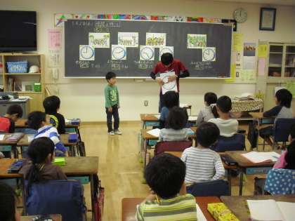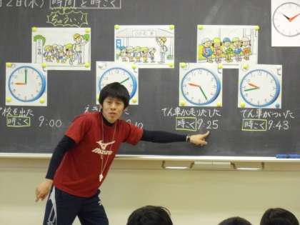 2年生の算数の授業の様子です。遠足を題材に、学校を出発した時刻、駅に着いた時刻、電車が出発した時刻、目的地に着いた時刻を並べ、時間について学習しているところです。2年生では、時間と分の関係を理解します。まるで遠足に行っているかのように楽しく勉強していました。