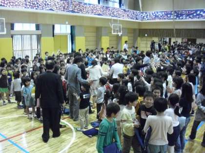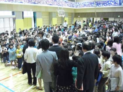 式が終わり、離任された先生方、主事さん方が子どもたちの間を通って退場します。子どもたちは少しでも近くでお別れの言葉を伝えようとしています。ハイタッチをしたり、握手をしたりと先生方、主事さん方への思いを表現していました。これからも芦花小の子どもたちを見守っていてください。