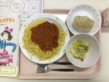 今日は、スパゲティーミートソース、イタリアンドレッシングサラダ、紅茶のカップケーキです。今月は図書月間です。今日は「こまったさんのスパゲティ」とのコラボレーション給食で、ミートソースを取り入れました。