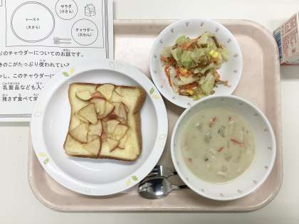 今日は、アップルトースト、森のチャウダー、ごぼうチップサラダ、牛乳です。