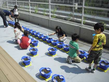 1年生がアサガオのお世話をしている様子です。1年生の教室にはテラスがあります。4クラスともそこでアサガオを育てています。身近にあるので便利です。今日は天気がとてもよくテラスに出ると風が気持ちよいほどです。1年生は、テラスにある水道から水をペットボトルに入れて自分の鉢に水をあげていました。