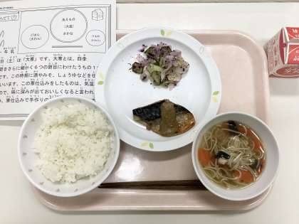 今日は、ごはん、魚のゴマだれかけ、野菜のゆかりあえ、そうめん汁、牛乳です。