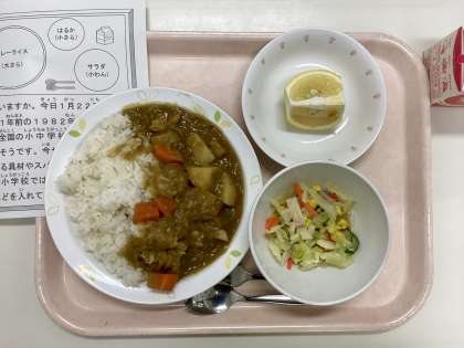 今日は、チキンカレーライス、コールスローサラダ、はるか、牛乳です。