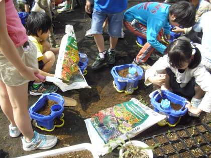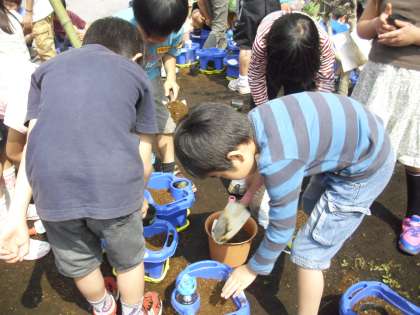 3年生の理科の授業の様子です。ひまわりの観察を行うため、植木鉢にひまわりの種をまく準備をしているところです。土を入れ、肥料を混ぜていきます。しっかりと観察ができるようにお世話をしていきます。