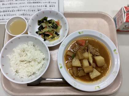 今日は、ごはん、韓国風肉じゃが、白菜とわかめの中華サラダ、りんごゼリー、牛乳です。