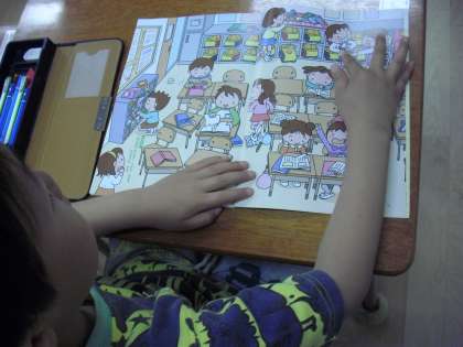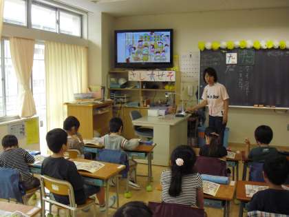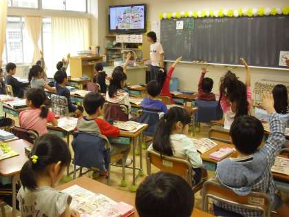 1年生の道徳の授業の様子です。教科書の絵をテレビにも映して、絵の中にある様々な出来事をみんなで見つけて考えているところです。「こまっている人はいるかな?」担任の問いかけに、子どもたちは教科書の中から見つけ出し手を挙げます。「どうしてそう思ったの?」「どんな気持ちだったのかな」自分なりの考えをもつことが大切です。