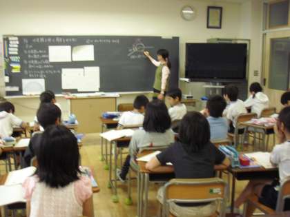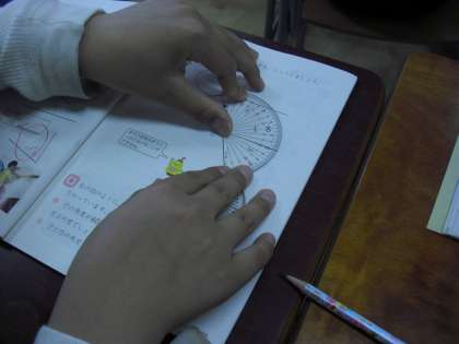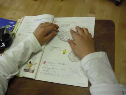 4年生の算数少人数指導の授業の様子です。角の大きさについて学習しているところです。分度器を正しく使いながら、単位や測定の意味を理解していきます。同じ角度を友達と確かめ合う作業等を通じて、正しい測定の仕方を身に付けていきます。