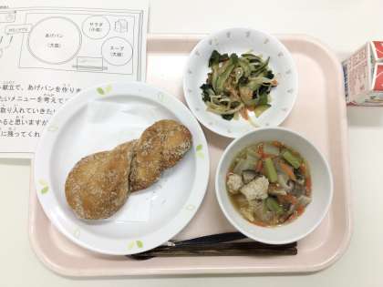 今日は、あげパン(ごま)、豆腐団子と春雨のスープ、わかめともやしのサラダ、牛乳です。
