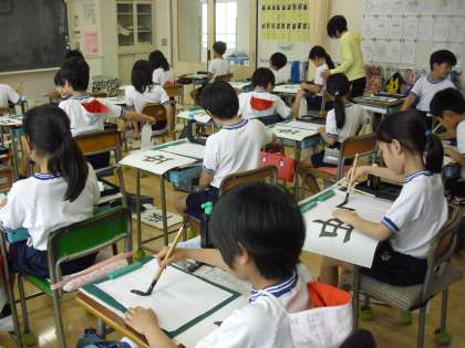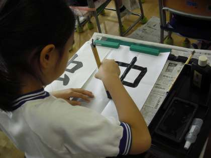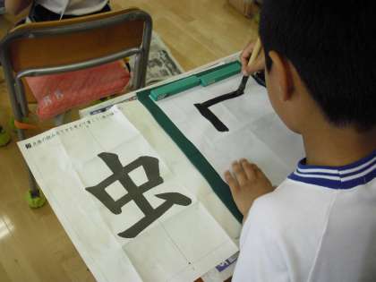 4年生の書写の授業の様子です。課題文字「虫」に取り組んでいるところです。4年生では、文字の組み立て方を理解し、形を整えて書くことがねらいです。集中力も養うことができます。四画目を中心に真っ直ぐ書くように気を付けながら書きました。
