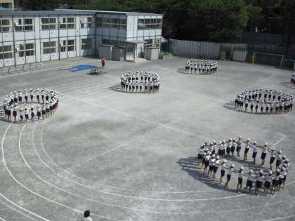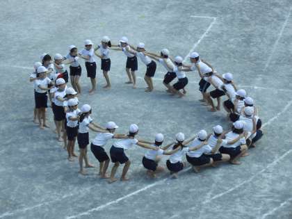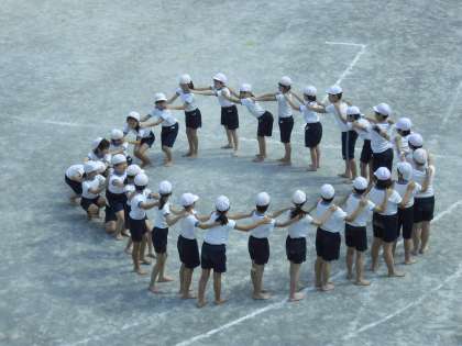5・6年生の合同体育の授業の様子です。組体操の一部である集団での表現に取り組んでいるところです。各クラスが一つの輪になり、波打つような動きを表現しています。一人一人がタイミングを図りながら協力して美しさや力強さの表現を目指します。