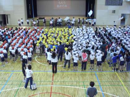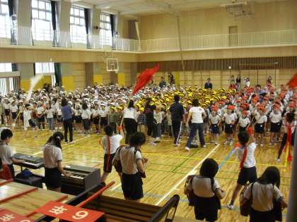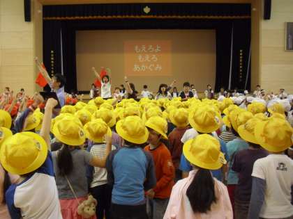 「あか、あか、あか、ゴーゴーゴー!」「しろ、しろ、しろ、ゴーゴーゴー!」と拳を突き上げながら互いに負けまいと力いっぱい歌います。「がんばるぞ」という子どもたちの思いの強さが運動会を盛り上げます。当日も精一杯歌います。