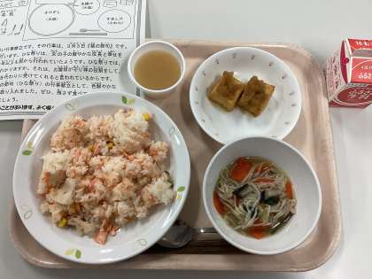 今日は、鮭ずし、生揚げおろしあん、そうめん入りすまし汁、桃のゼリー、牛乳です。
