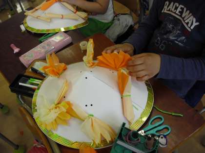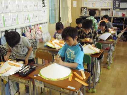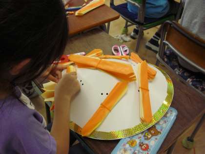 3年生が運動会で使う花笠を作っている様子です。お花紙を使って飾りを作っているところです。なかなか難しく時間がかかりますが、友達と助け合いながら作業を進めました。3クラスで黄色系、青系、赤系のグラデーションを意識した笠です。すてきな笠になりそうです。
