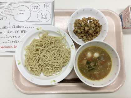 今日は、みそラーメン、カリカリのりじゃが豆、牛乳です。