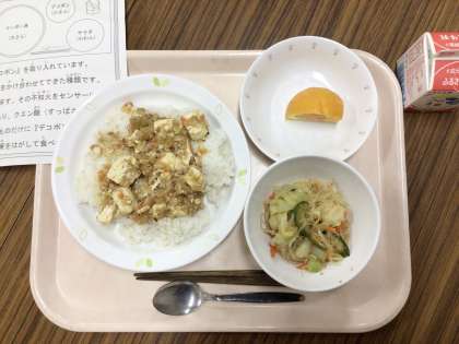 今日は、マーボー丼、春雨サラダ、デコポン、牛乳です。