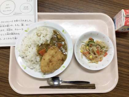 今日は、カツカレー、こんにゃくサラダ、牛乳です。