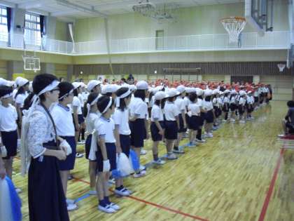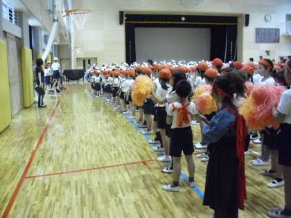 今年の運動会のスローガンは「いざ出陣 本気でぶつかれ チーム芦花」です。全員で声をそろえてスローガンを発表します。昨年の6年生が残してくれた「チーム芦花」の精神を受けついでがんばります。