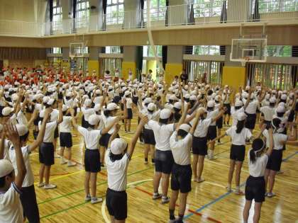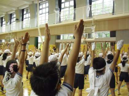 開会式が終わり、準備運動です。準備運動も立派な演技です。手足をしっかり伸ばして運動する姿から運動会を成功させたいという思いが伝わってきます。