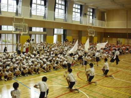 全員で盛り上げる芦花小ウェーブ。当日は校庭にチーム芦花の大きな波を作ります。最後はエールの交換です。お互いに全力をつくして悔いの残らない運動会にしたいと思います。