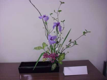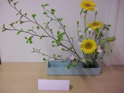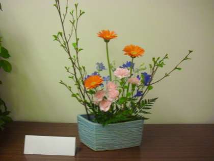 中学校の活け花部の作品です。中学校や小学校の玄関や廊下のスペースに飾ってあります。落ち着いた気持ちにさせてくれます。小さなところに温かな気配りを感じます。