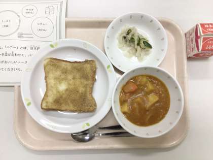 今日は、ごまハニートースト、ハンガリアンシチュー、大根とツナのサラダ、牛乳です。
