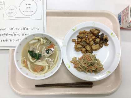 今日は、味噌煮込みうどん、魚と大豆のかりんとうがらめ、ごま酢あえ、牛乳です。