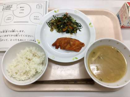 今日は、ごはん、鰆のコチジャン焼き、野菜の磯あえ、大根のみそ汁、牛乳です。