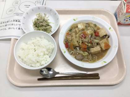 今日は、ごはん、家常豆腐、ナムル、牛乳です。
